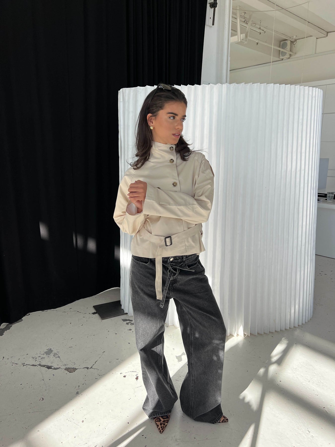 Vores Zoey trenchcoat i farven beige er designet med høj hals og fine brune knapper foran, der både er praktiske og stilfulde. Den har et bindebånd i taljen med spænde, så du nemt kan justere pasformen efter eget ønske – om den skal sidde tæt eller lidt løsere.