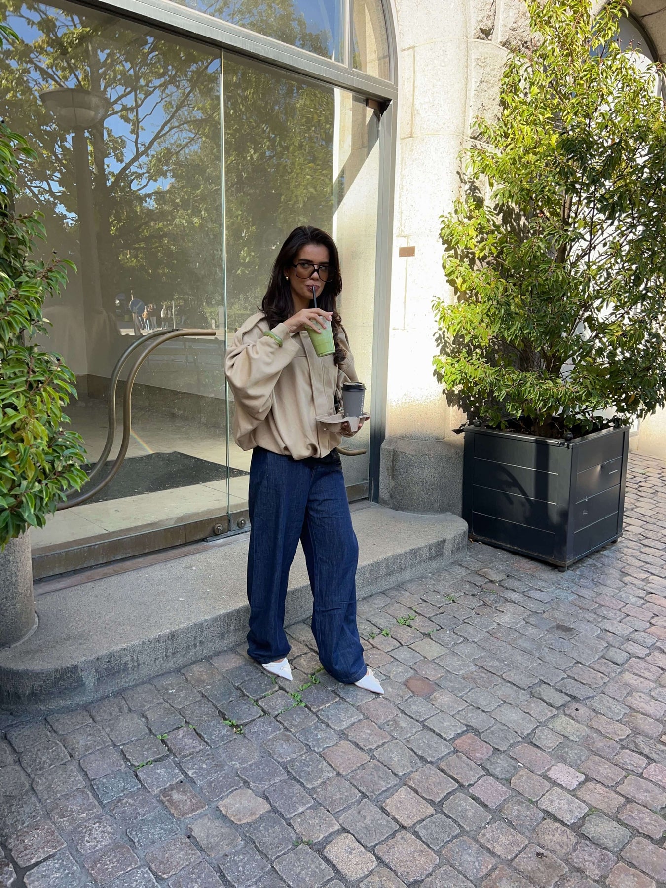 Vores blå denim-lignende Jua bukser har den helt rigtige baggy pasform, der giver et afslappet og cool look uden at gå på kompromis med stilen. Bukserne har både lynlås og knaplukning, lommer foran og bagpå samt bæltestropper. Med lidt ekstra længde er de nemme at style til både hverdagsbrug og til festlige anledninger.