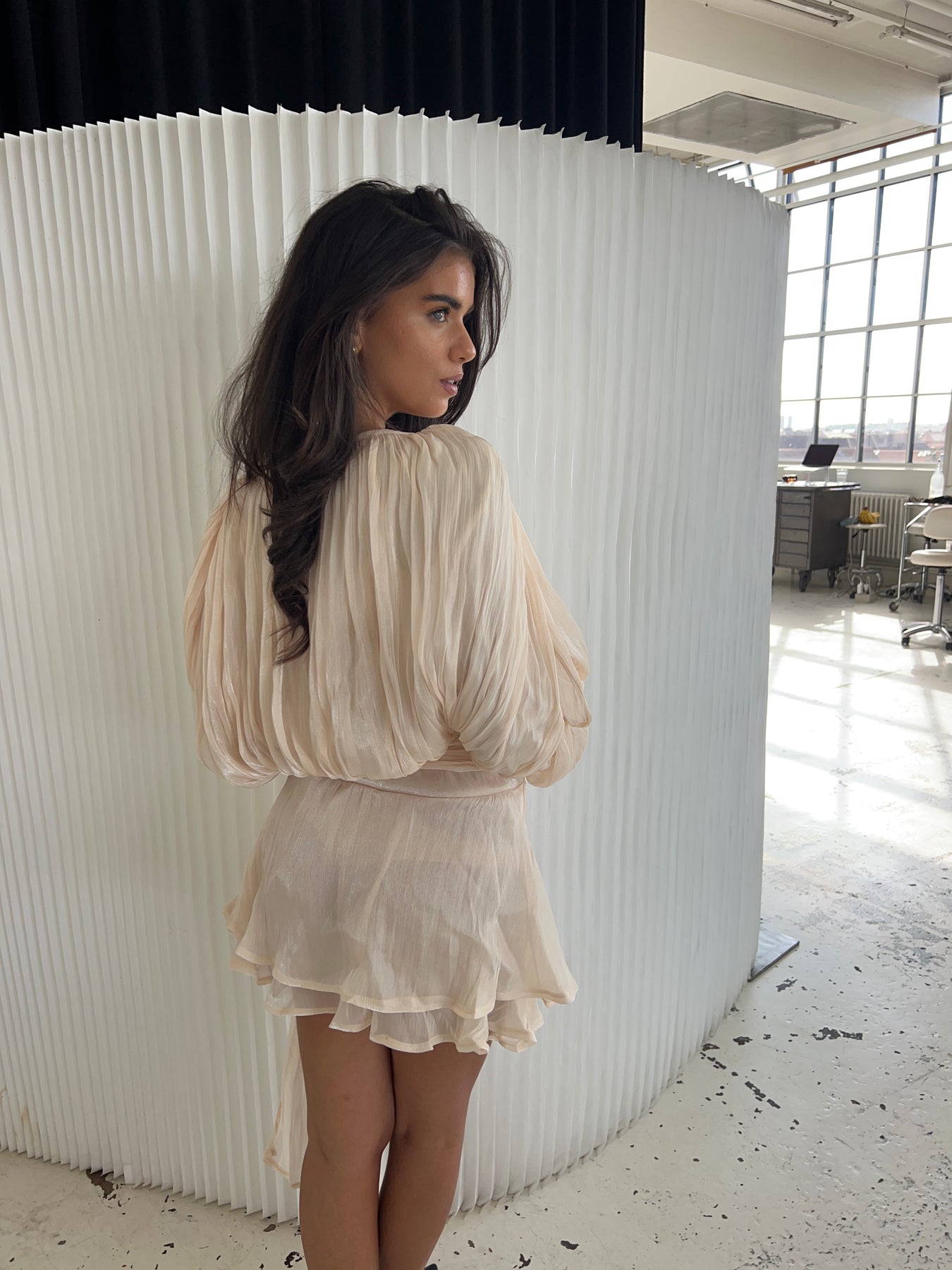 Vores Kalia mini kjole er indbegrebet af det feminine blandet med ren elegance. Kjolen er designet i et let, glansfuldt materiale, der falder smukt og skaber et luftigt udtryk. Den har lange, løstsiddende ærmer med knapper for enden og et bindebånd i taljen, som fremhæver figuren på en flatterende måde. Den korte, lagdelte nederdel giver kjolen et romantisk og legende look udtryk og er perfekt til enhver anledning, uanset om du skal til fest eller blot har en aften ude.