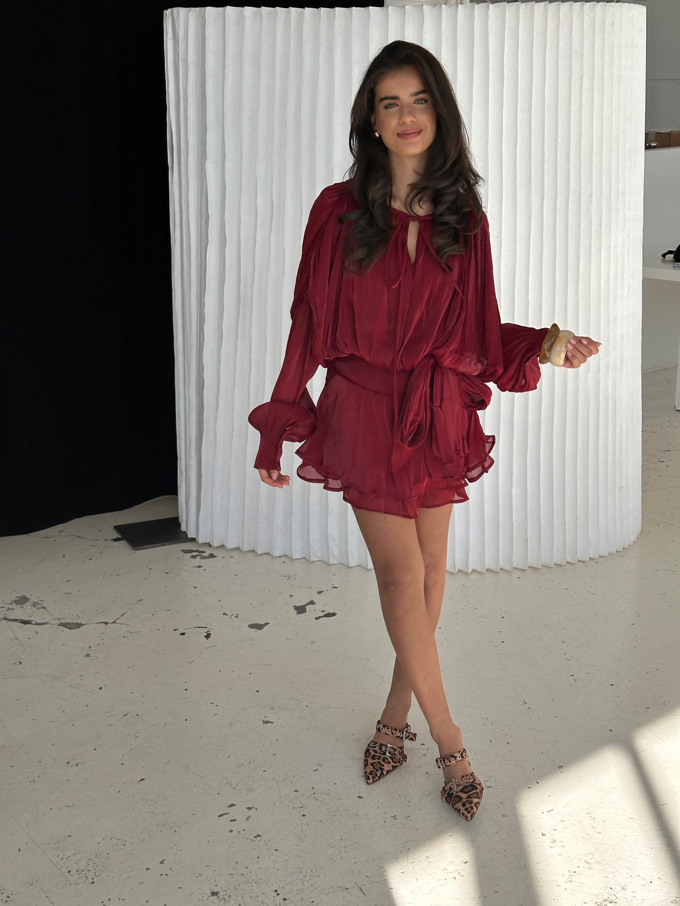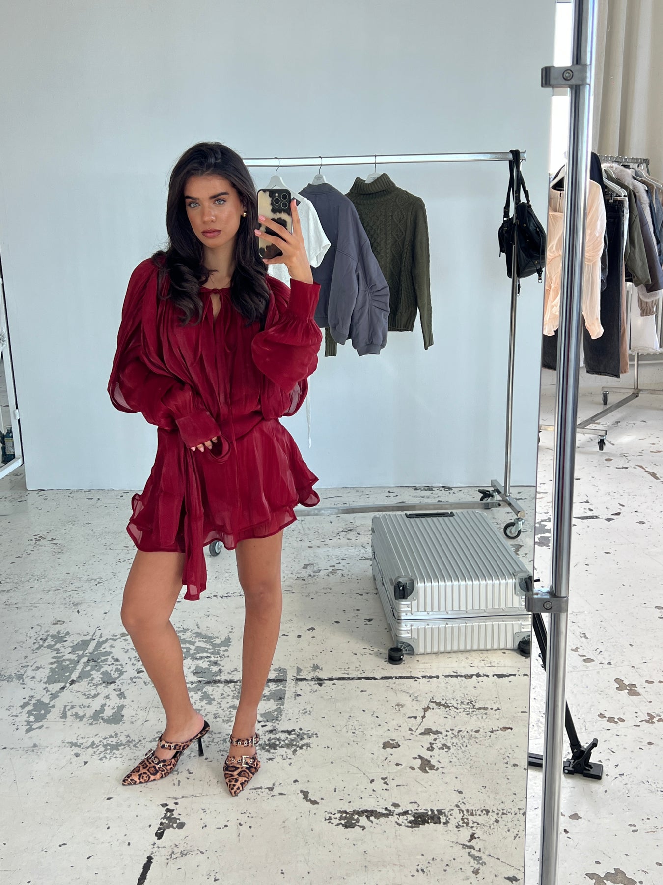 Vores Kalia mini kjole er indbegrebet af det feminine blandet med ren elegance. Kjolen er designet i et let, glansfuldt materiale, der falder smukt og skaber et luftigt udtryk. Den har lange, løstsiddende ærmer med knapper for enden og et bindebånd i taljen, som fremhæver figuren på en flatterende måde. Den korte, lagdelte nederdel giver kjolen et romantisk og legende look udtryk og er perfekt til enhver anledning, uanset om du skal til fest eller blot har en aften ude.