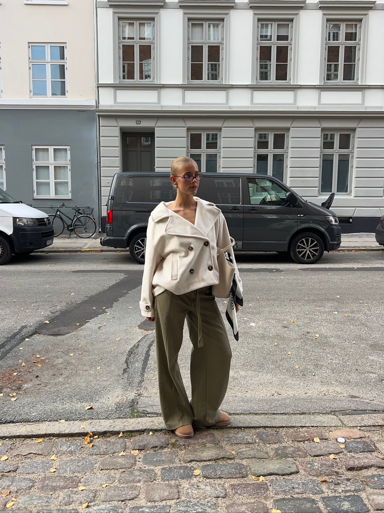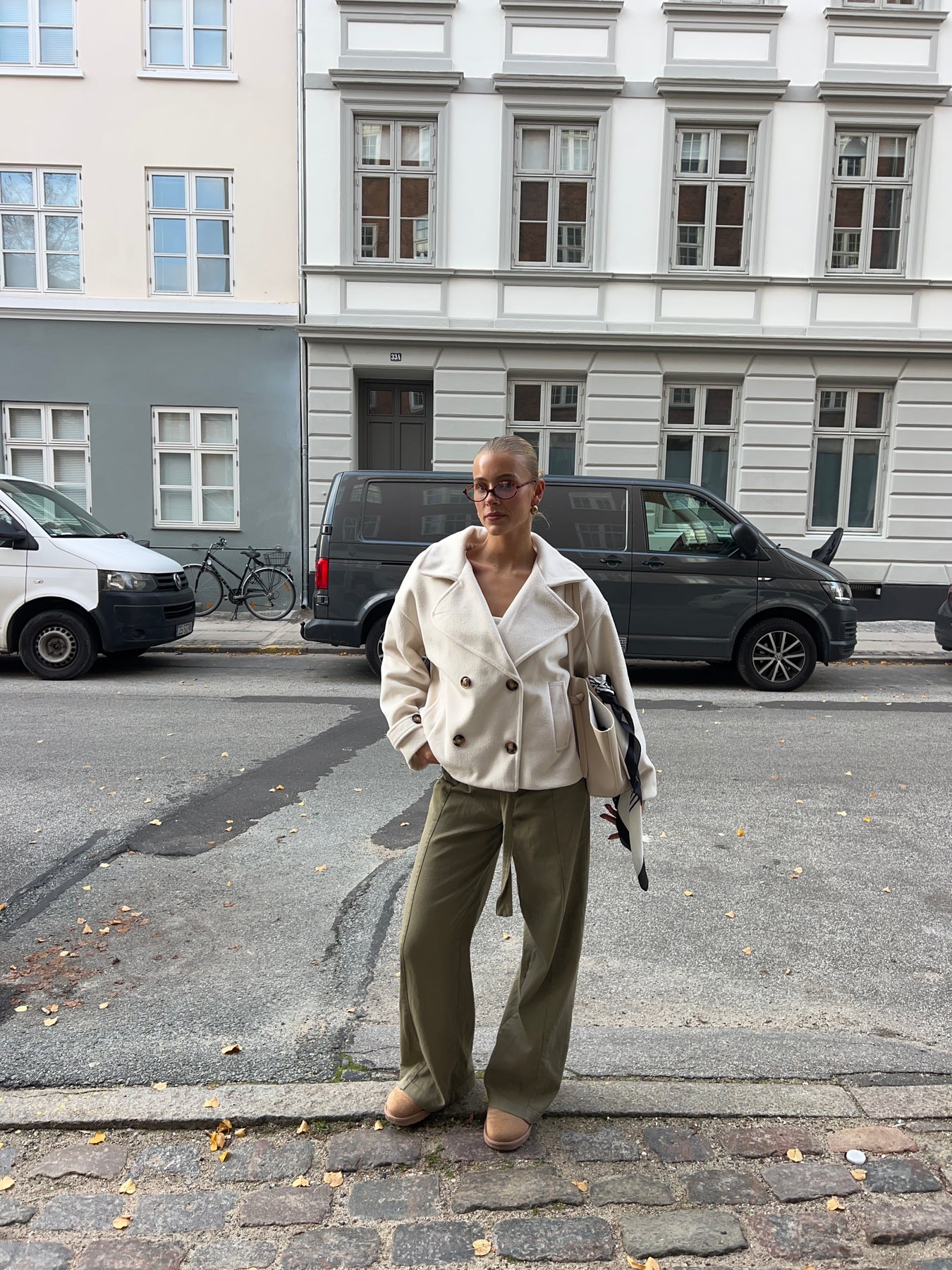 Kelly frakken er en tidløs og elegant kort frakke, perfekt til overgangs- og efterårssæsonen. Den har en dyb V-udskæring og lukkes med smukke brunlige knapper, som giver et klassisk og stilrent udtryk. Ærmerne har også fine knapdetaljer, der tilføjer et ekstra touch til en ellers enkelt og alsidig jakke, der kan styles over alt fra jeans til kjoler – ideel til de køligere dage, hvor du stadig vil bevare et sofistikeret look.