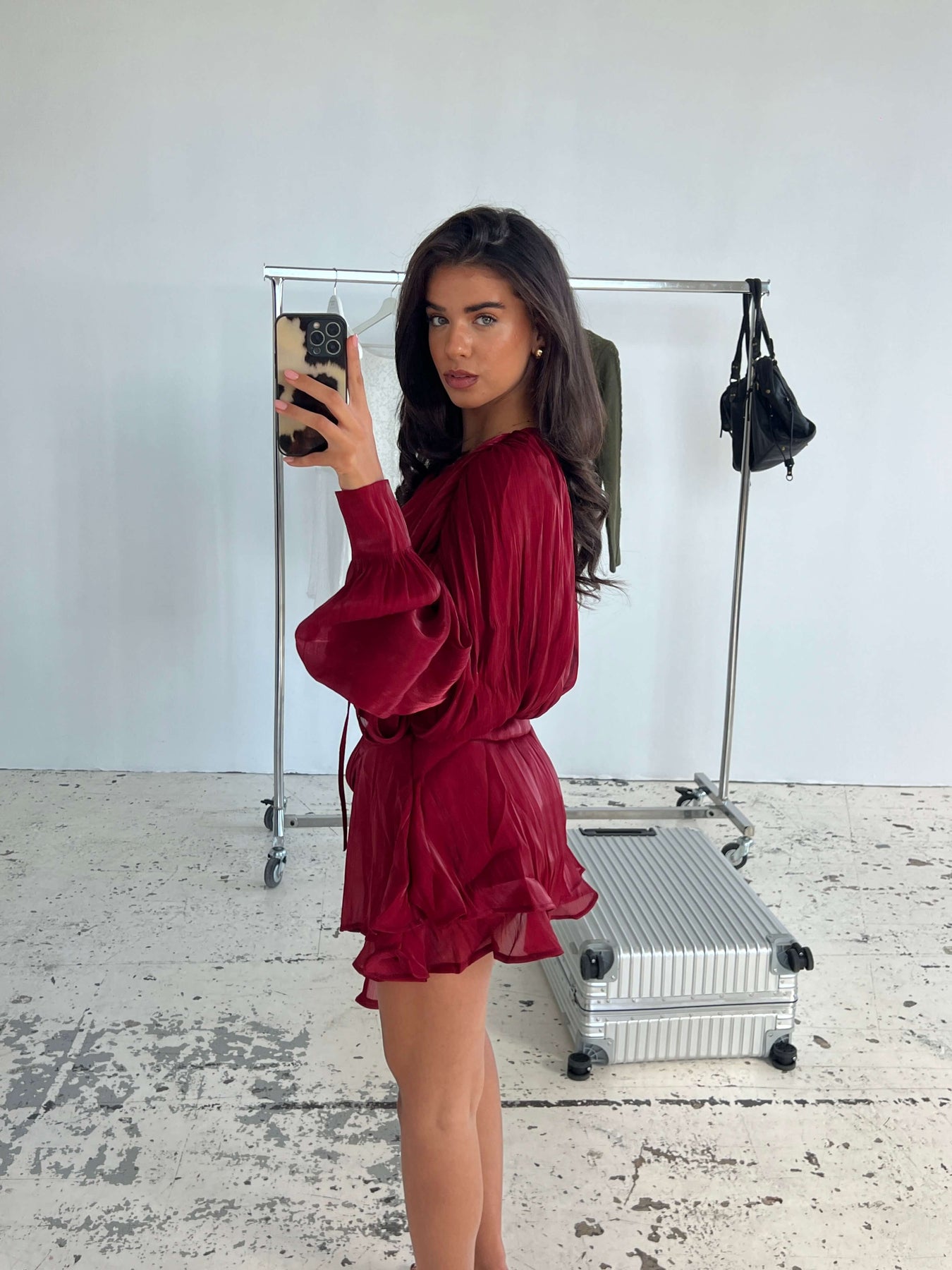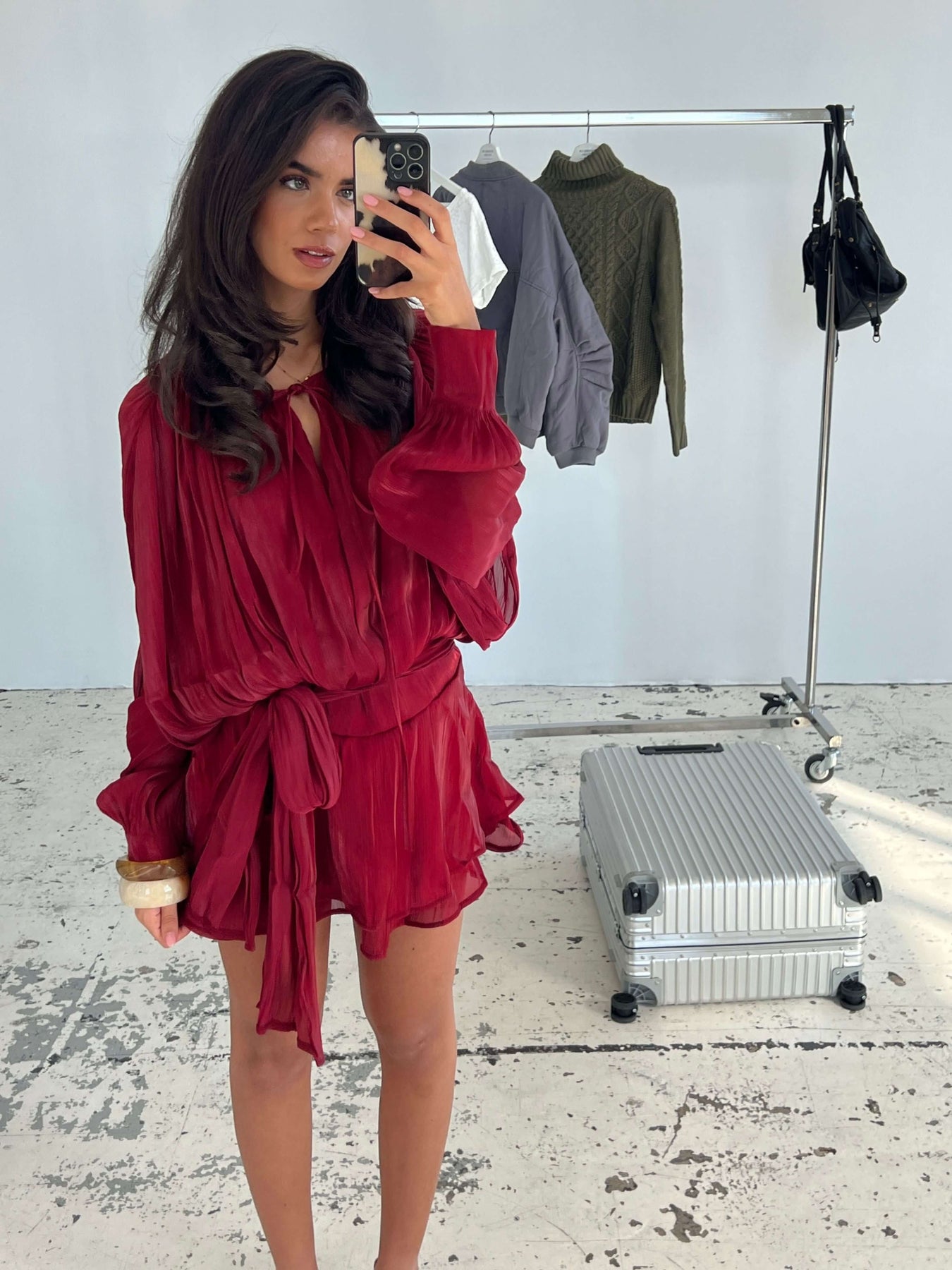 Vores Kalia mini kjole er indbegrebet af det feminine blandet med ren elegance. Kjolen er designet i et let, glansfuldt materiale, der falder smukt og skaber et luftigt udtryk. Den har lange, løstsiddende ærmer med knapper for enden og et bindebånd i taljen, som fremhæver figuren på en flatterende måde. Den korte, lagdelte nederdel giver kjolen et romantisk og legende look udtryk og er perfekt til enhver anledning, uanset om du skal til fest eller blot har en aften ude.