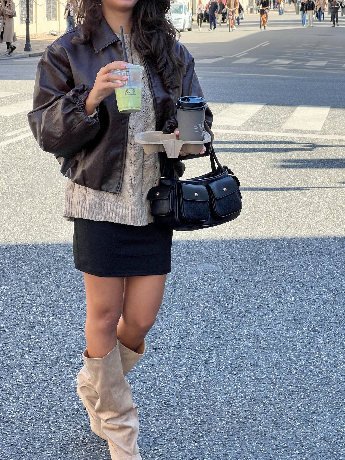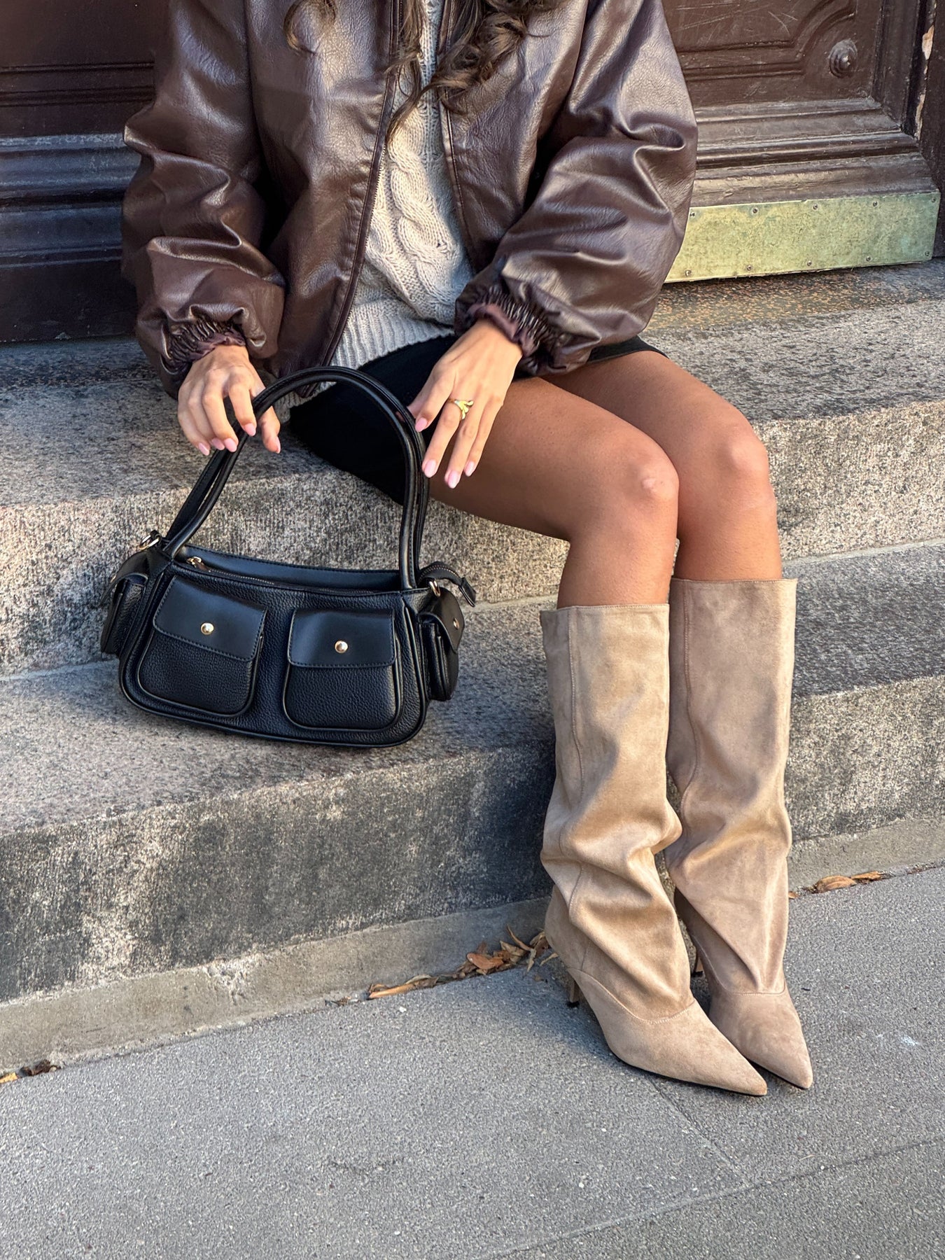 Vores Karla skuldertaske er en moderne og alsidig taske med et elegant, tidløst design. Den er lavet i et blødt, strukturpræget materiale og har to frontlommer med guldknapper, der giver et stilrent og funktionelt udtryk. Tasken lukkes med lynlås og har en rummelig inderside, perfekt til hverdagens essentials. De dobbelte hanke gør den behagelig at bære over skulderen – et ideelt valg til både hverdag og arbejde.