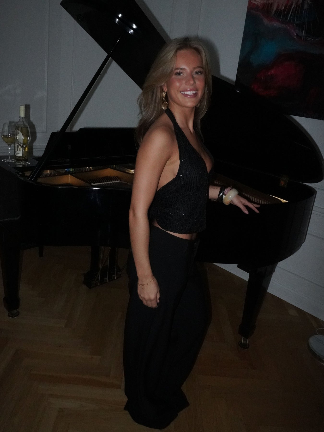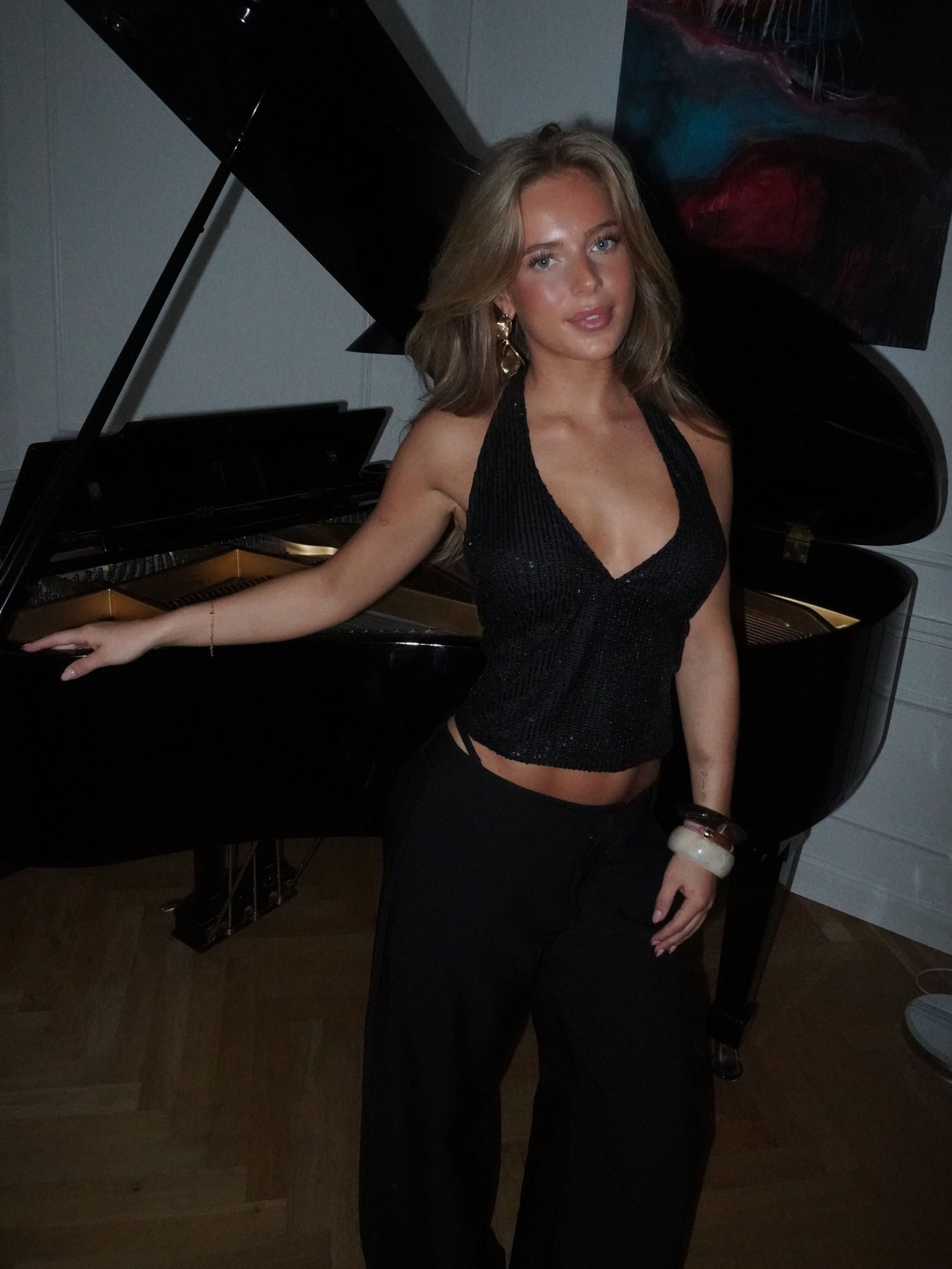 Vores smukke Lola glitter bindebånds top, kombinerer et elegant look med en masse glitter, som giver et festligt touch. Toppen kan styles med en fin nederdel eller et par jeans/bukser, hvilket gør den nem at tilpasse enhver lejlighed. Toppen kan bindes bagpå og giver en flot figursyet talje.