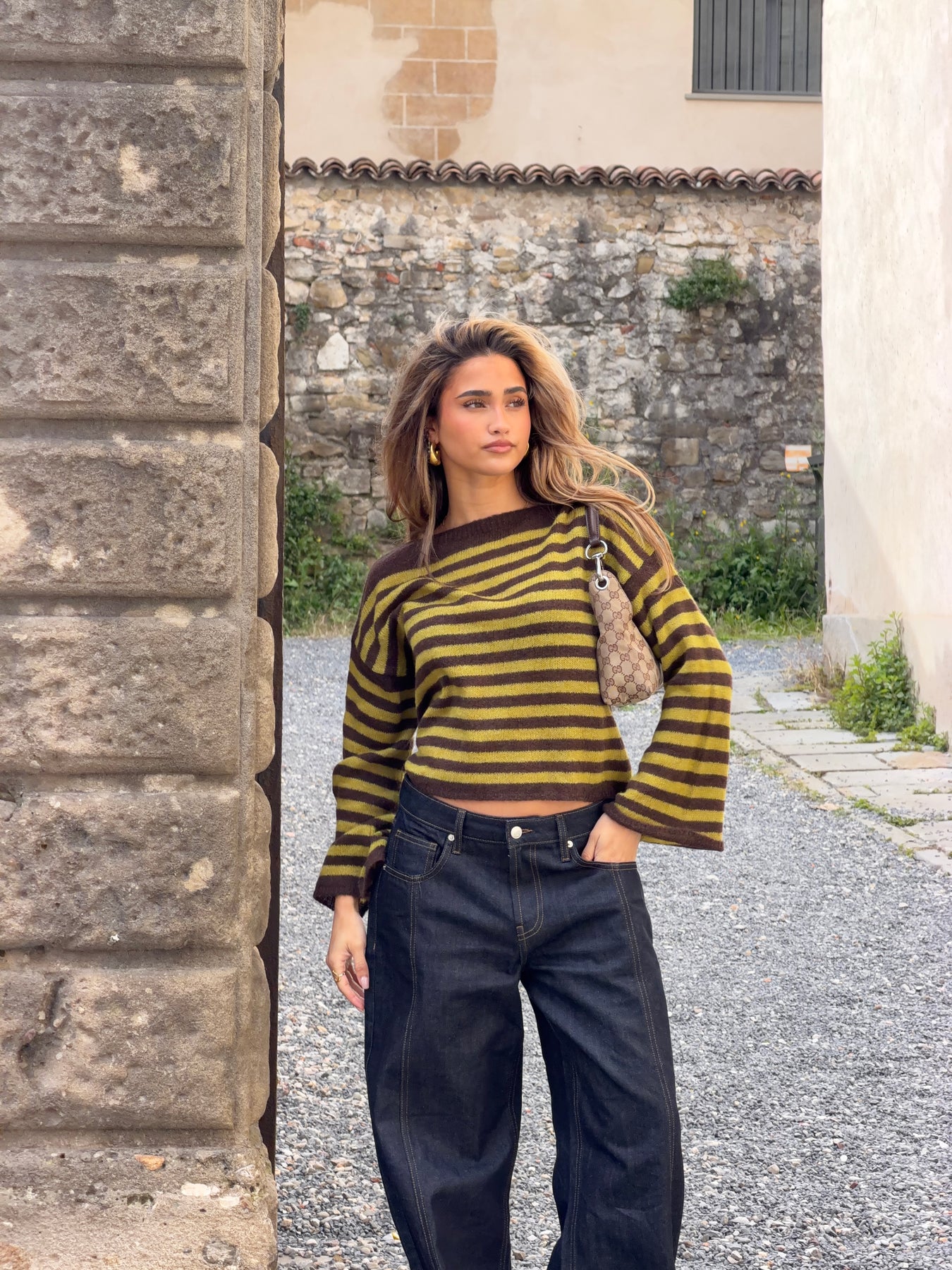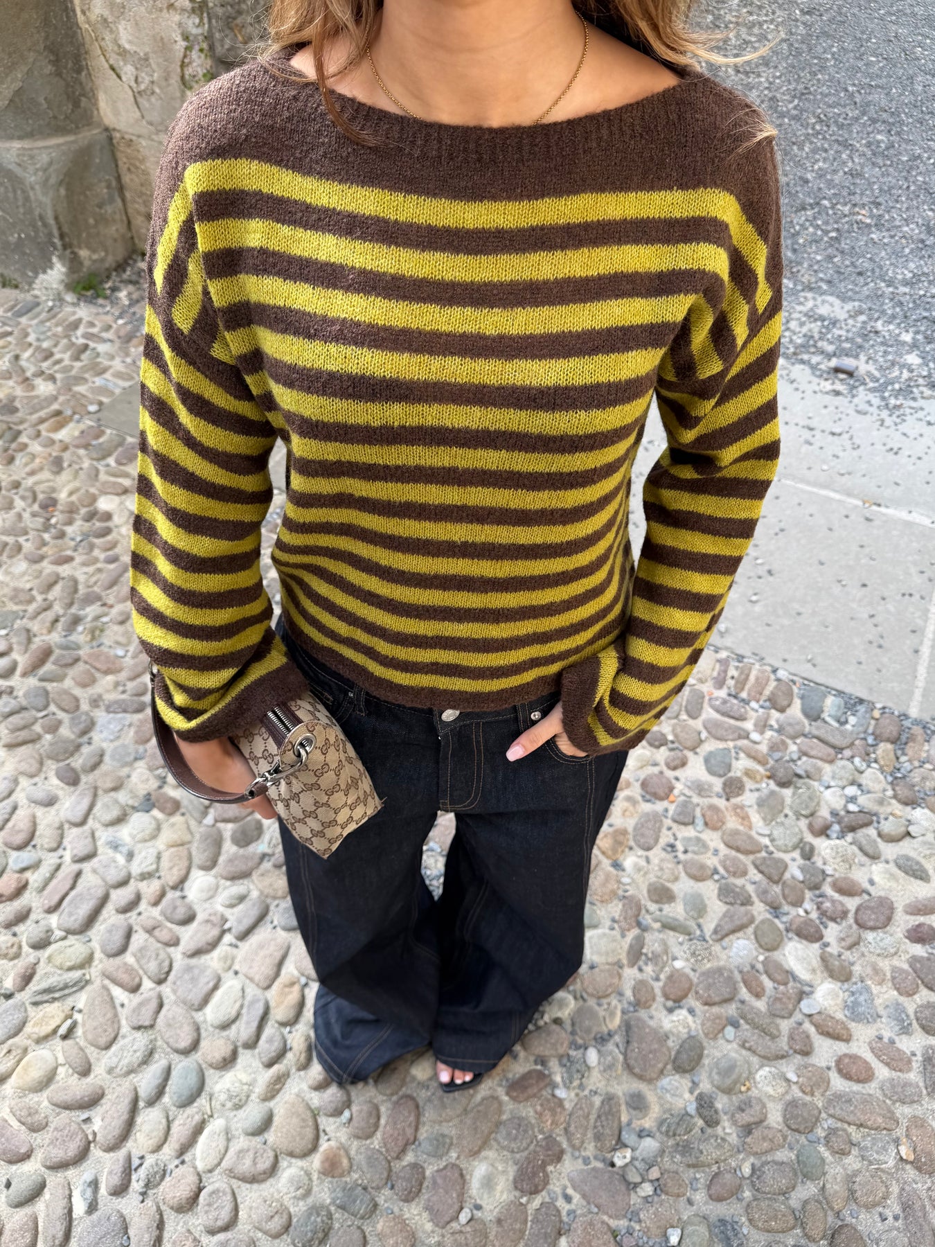 Oline stribet boat neck striktrøje - Brun/Grøn