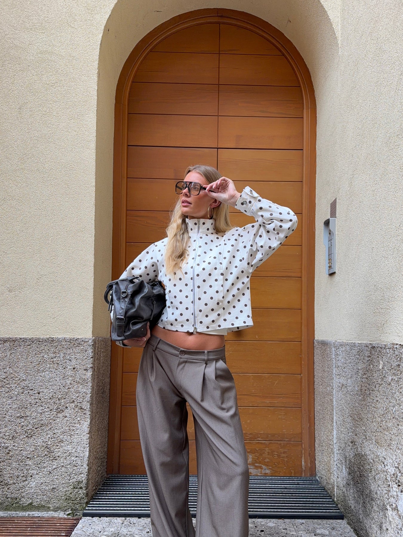 Vores Lenoa fitted polkaprikket jakke i brun/hvid kombinerer et legende mønster med et stilrent og feminint snit. Jakken har en tætsiddende pasform og er designet i hvid med brune polkaprikker, som giver et moderne og iøjnefaldende udtryk. Den lukkes med en lynlås foran. De lange ærmer og den let høje hals tilfører jakken et elegant touch, mens den cropped længde skaber et moderne look. En alsidig jakke, der nemt kan styles til både hverdagsoutfits og mere gennemførte looks.